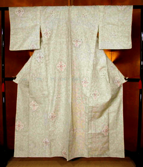 淡い色合いと絣の紬風仕立ては、遠目には白大島や