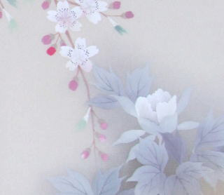 縮緬生地に、しだれ桜とボタンが手描きされています。