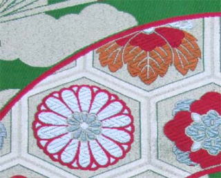 昭和40年代 当時流行色のグリーン緞子地 の袋帯です。朱の振袖やクリーム地など と好んで組み合されました。 着用の跡はほとんど見られません。 金糸、銀糸の織り糸のきれいな状態です。 扇面は末広としてお嬢様の将来の幸福を 願われてえらばれたのでしょう。 アンティークの訪問着や振り袖をお持ち の方、幸せを扇に託してお嬢様に結んで 差し上げてください。 帯幅 30cm 長さ 4m |注文| |HOME| |リサイクル帯3の一覧ページへ戻る| お問い合わせ E-mail:kp-maekawa@koromonnouta.com メールでのお問い合わせには商品番号をご記入願います お電話でのお問い合わせは下記の衣の詩まで